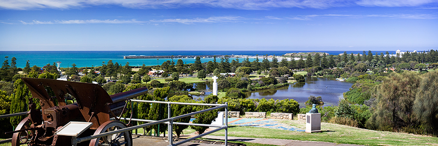 View from Cannon Hill across Lake Pertobe to the breakwater at Warrnambool, south west Victoria, Australia. Click here to view products available for this image.
