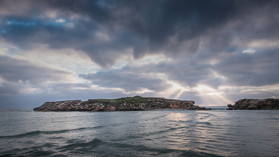 Setting sun casts rays across Middle Island in Warrnambool, Victoria, Australia. Click here to view products available for this image.