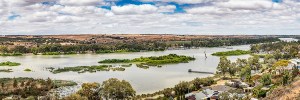 View of gently flowing Murray River as it passes alongside town of Mannum in eastern South Australia. Click here to see wall art available for this photo.