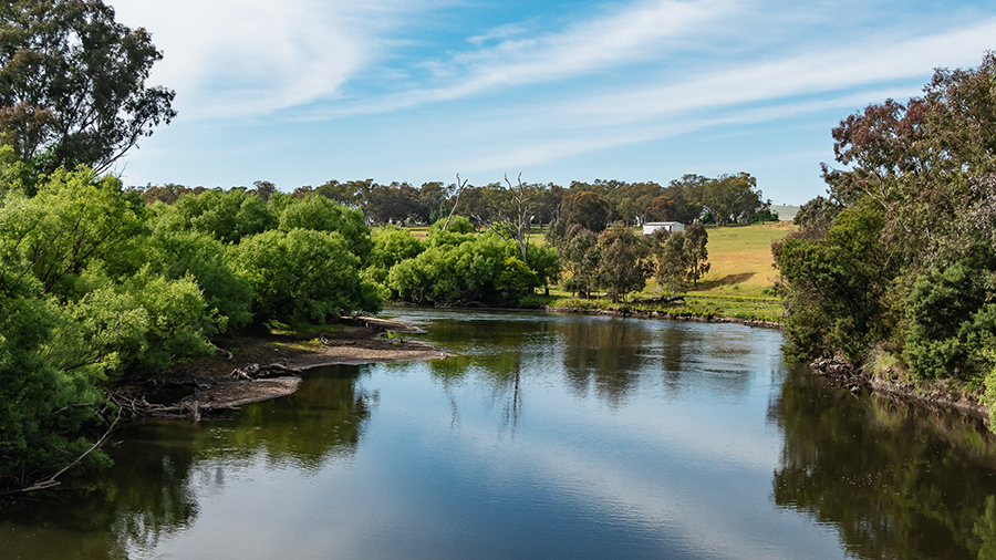 Early in its journey to the sea, Murray River flows clear and blue through green pastures and bush. Photo taken near Tintaldra in far north east Victoria, Australia. Click here to see wall art available for this photo.