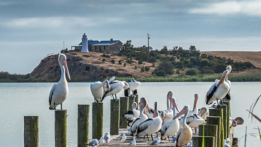 Pelicans take over the jetty opposite Narrung lighthouse, which indicates the narrow channel of water between lakes Alexandrina and Albert in south east South Australia. Click here to see wall art available for this photo.